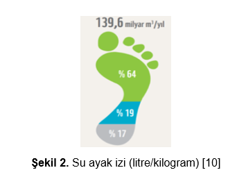 Türkiye’de üretimin toplam su ayak izi miktarı 139,6 milyar m3/yıl’dır. Bu miktarın %64’ü yeşil su ayak izi, %19’u mavi su ayak izi ve %17’si gri su ayak izidir (Şekil 2). Türkiye’de su ayak izinin en büyük payını %89 ile tarım sektörü oluşturmaktadır. Tarım su ayak izinin ise %92’sini bitkisel üretim temsil ederken, %8’ini hayvan yemleri temsil etmektedir [10]. Hayvansal su ayak izinin en büyük payını tüketilen yem miktarı oluşturmaktadır. Herhangi bir et türünün su ayak izinde hayvanların beslenmesi belirleyici bir etmendir [8].